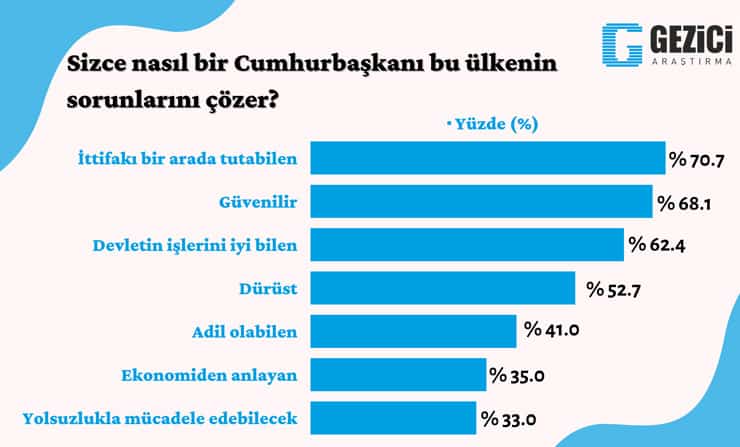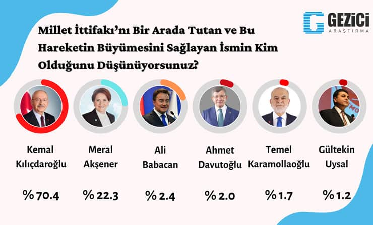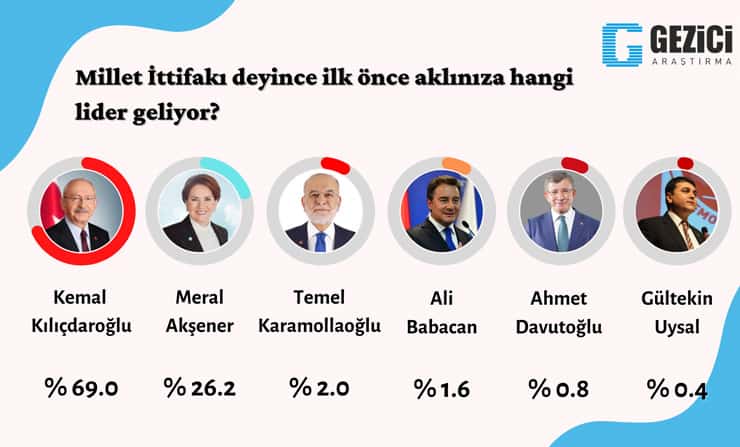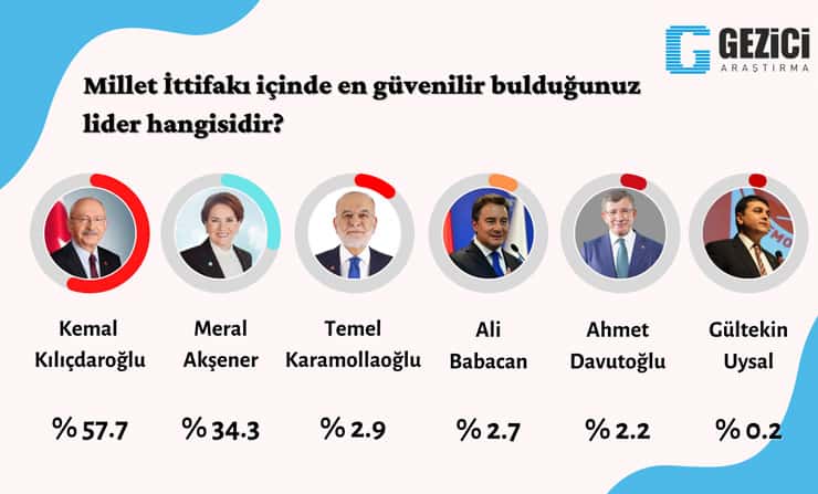 Kılıçdaroğlu, ‘millet ittifakı’nın büyümesini sağlayan isim olarak görülürken, ‘lider’ denince akla ilk gelen kişi oldu. Ayrıca ittifak içindeki ‘en güvenilir kişi’ gösterildi.