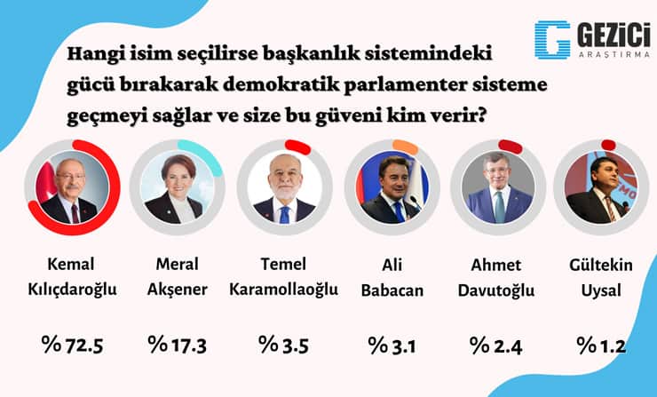 Gezici Araştırma’nın anketine göre parlamenter sisteme geçiş için ortak metin açıklayan altı partinin oy oranı toplamı yüzde 44,8 oldu. AKP, MHP ve BBP ittifakıysa yüzde 40,2.