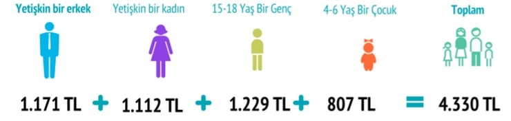 Yetişkin bir erkeğin gıda harcaması 1171 lira. Yetişkin bir kadında bu rakam 1112. Bir gencin gıda harcaması 1229 lira. Çocuk için bu rakam 807 lira.