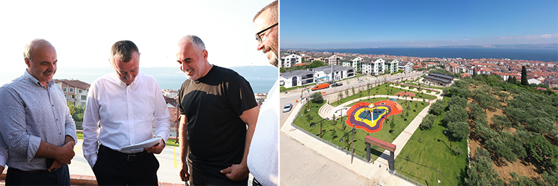 Karamürsel Millet Bahçesi’ni yerinde inceleyerek firma yetkililerinden bilgi alan Başkan Büyükakın, ekiplerin yoğun çalışması sonucu Millet Bahçesi’nin %90’ının tamamlandığını söyledi. Millet bahçesinin doğayla iç içe, keyifli ve dinlendirici bir mekan olarak tasarladığını dile getiren Başkan Büyükakın, “Kocaeli Büyükşehir Belediyesi, hayata ve insana dokunan özel proje ve sosyal destek programlarıyla farklı alanlarda ihtiyaç duyulan her türlü hizmeti veriyor. Karamürsel Millet Bahçesi, 7’den 70’e herkesin faydalanabileceği şekilde projelendirildi. Restoran binası, otopark, seyir terasları, yürüyüş yolları, çocuk oyun grubu ve fitness alanlarıyla sosyal yaşam alanı oldu. Yeşilin her tonunu görebileceğiniz millet bahçesi Karamürsellilerin ilk adresi olacak” dedi.