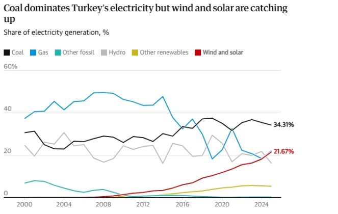 Türkiye’nin mevcut enerji karması bu dönüşümün hem fırsatlarını hem de sınırlarını yansıtıyor. Elektrik üretiminin yaklaşık beşte biri rüzgâr ve güneşten sağlanıyor. Bu oran, Orta Doğu ve Orta Asya ülkelerinin üzerinde olsa da Avrupa ortalamasının gerisinde. Buna karşılık kömür hâlâ sistemin önemli bir parçası ve geçtiğimiz yıl elektrik üretiminin %34’ünü oluşturdu. Üstelik bu alan ciddi sübvansiyonlarla desteklenmeye devam ediyor.