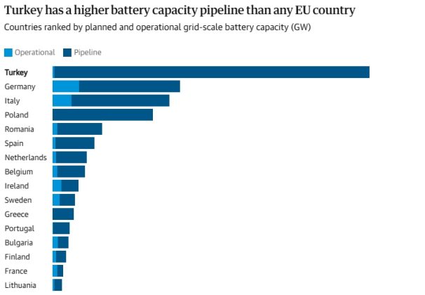 İklim politikaları üzerine çalışan Ember’ın analizine göre Türkiye, 2022’den bu yana elektrik şebekesi için 33 GW’ın üzerinde batarya kapasitesine onay verdi. Bu rakam, enerji dönüşümünde öncü kabul edilen Almanya ve İtalya gibi ülkelerdeki toplam planlı ve faal kapasitenin (12-13 GW) oldukça üzerinde. Başka bir ifadeyle Türkiye, henüz yolun başında olmasına rağmen ölçek açısından Avrupa’nın önüne geçmiş durumda.