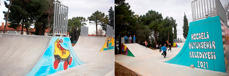 Kocaeli’de gençleri spor ve sanatın çeşitli dallarıyla buluşturan Büyükşehir, yakın zamanda Karamürselli gençleri sentetik buz pateni ve skate park (kaykay pisti) sporuyla tanıştıracak. Buradaki çalışmaları yürüten Park ve Bahçeler Dairesi Başkanlığı ekipleri, sentetik buz pistinde dış bord sistemini ve iç puzzle zemin sistemi imalatı çalışmalarını tamamladı. Böylelikle Kocaeli’nin ilk sentetik buz pisti son şeklini alırken, kaykay pistinin yapımının ise son aşaması da tamamlanarak hazır hale getirildi. Bu doğrultuda pistin üst betonu atıldıktan sonra grafiti çalışması yapıldı. Park ve Bahçeler Daire Başkanlığı’nın peyzaj işlemleri ise devam ediyor. Sentetik buz pisti ve skate parkın tamamlanmasıyla Karamürsel’de gençler, iklim şartları gözetmeksizin paten sporunun keyfini doyasıya yaşayacak.