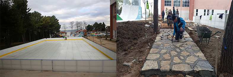 Bu arada çalışmalar kapsamında tesisin etrafı çocuk oyun grupları ve macera parkuru gibi alanlar ile zenginleştirildi. Çocuk oyun grubunun montajı yapıldı ve zemine de yere düşüldüğünde olası zararı minimuma indirmek için esnek malzeme serildi. Aynı şekilde macera parkurunun grup imalatı da tamamlandı.