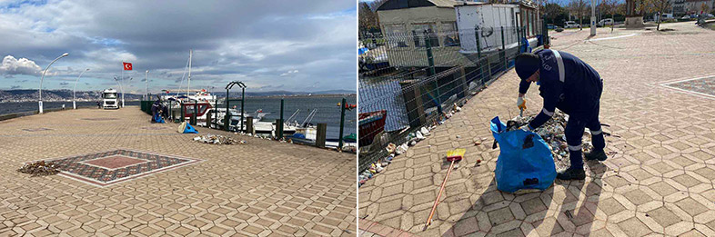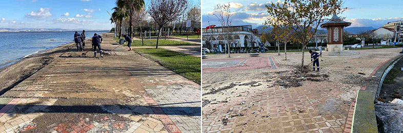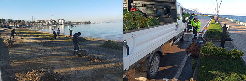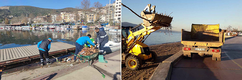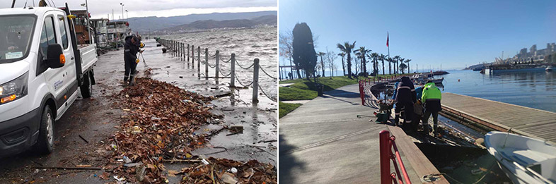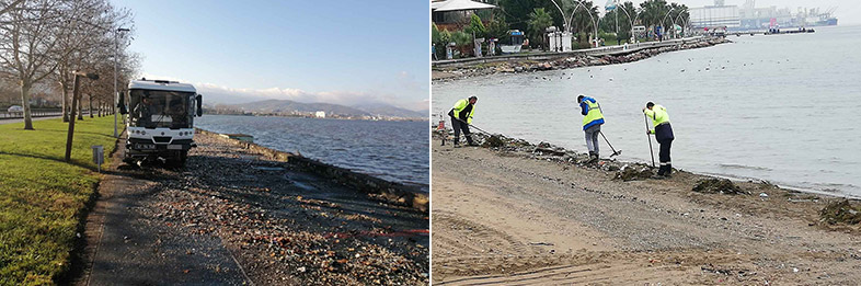 Park ve Bahçeler Dairesi Başkanlığı’na bağlı ekipler, İzmit Körfezi boyunca Derince, Körfez, Gebze, Darıca, Dilovası, Başiskele, Gölcük, Karamürsel ve İzmit sahillerinde ve Kandıra’nın sahil kesiminde yaşanan olumsuzlukları ortadan kaldırmak için temizlik harekatı başlattı. Rutin olarak hemen her gün sahil ve parklarda temizlik çalışmalarını yürüten ekipler, lodosun ardından yosun, plastik atıklar ve ağaç dallarından oluşan 100 kamyon dolusu atığı sahillerden topladı.