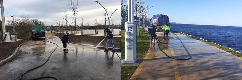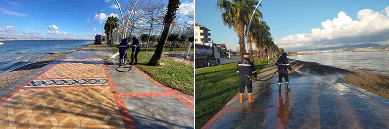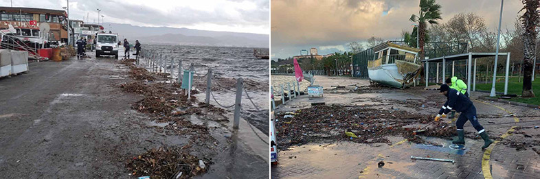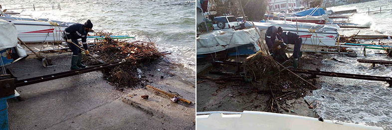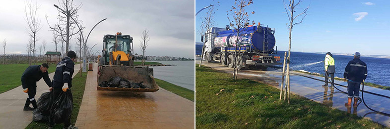 Yaklaşık 300 kişilik ekip, temizlik araçlarıyla birlikte vatandaşların ve balıkçıların lodosun sürüklediği atıklardan olumsuz etkilenmemesi için aralıksız çalıştı. Temizliği tamamlanan sahillerde ardından tazyikli suyla yıkama işlemine geçildi. Plajlarda ise kumsal tahkimatı yapıldı.