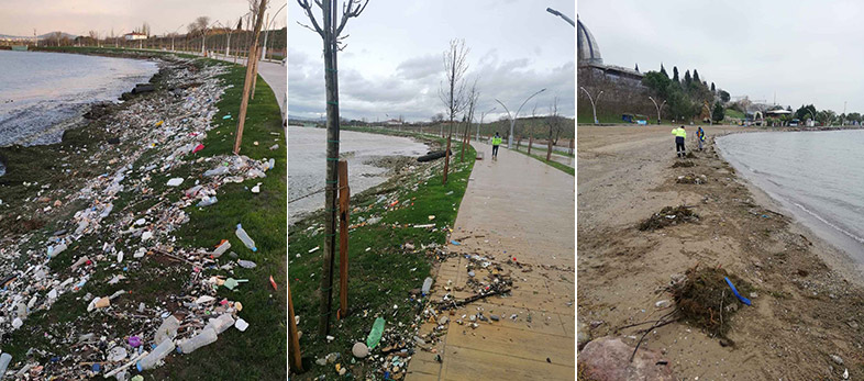 Bölgemizi etkisi altına alan şiddetli fırtınadan İzmit Körfezi’nde yer alan sahil kesimleri olumsuz etkilendi. İnsan eliyle denize atılan plastik atıklar, derelerden sürüklenen ağaç dalları ve yosunlar, lodosun etkisiyle sahillerde toplandı. Şiddetli fırtınayla beraber teyakkuza geçen Büyükşehir ekipleri, kent genelinde olduğu gibi sahil alanlarında da lodosun olumsuz etkilerini ortadan kaldırmak için canla başla çalıştı.