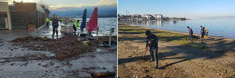 Marmara Bölgesi ve Kocaeli’ni etkisi altına alan lodos ve yağışlı havanın ardından Kocaeli büyükşehir Belediyesi’ne bağlı ekipler, İzmit Körfezi ve Kandıra sahillerinde hummalı bir çalışma başlattı. Park ve Bahçeler Dairesi Başkanlığı’na bağlı ekipler temizlik araçlarıyla birlikte lodos nedeniyle sahillerde toplanan atıkları temizledikten sonra tazyikli suyla da temizlik yaptı. Plaj alanlarda ise kumsal tahkimatları tamamlandı.