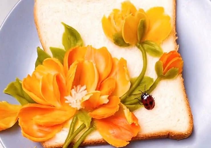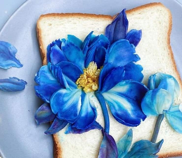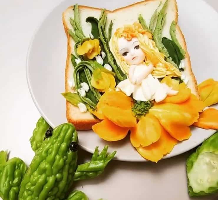 Çinli sanatçının malzemeleri tost ekmeği, püre haline getirilmiş sebze ve meyveler. Tost ekmeği dilimlerini, tatlı patates püresinden yaptığı çiçeklerle, avokado veya bezelye püresinden yapılmış dallarla, ağaçlarla ve türlü renklerdeki başka meyve ve sebzelerin ezilmiş haline form vererek süslüyor.